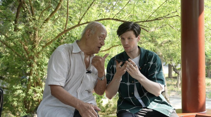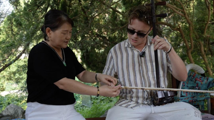 排排坐,听二胡,86岁老人的演奏让四人沉浸其中。挪威小伙们开始轮番尝试学习二胡演奏。Isak连嘴都在努力,但声音怎么说呢,不能说难听,只能说和我们认识的二胡还是有点差距的,不过咱们的二胡老师很温柔,做出如下鼓励“挺好的,没有杀鸡声”。你品,你再品,中国人的情商确实有目共睹,我们尊重所有好学者~老师给面子,但Naro确实没忍住,一通笑场,扎心了,老铁!